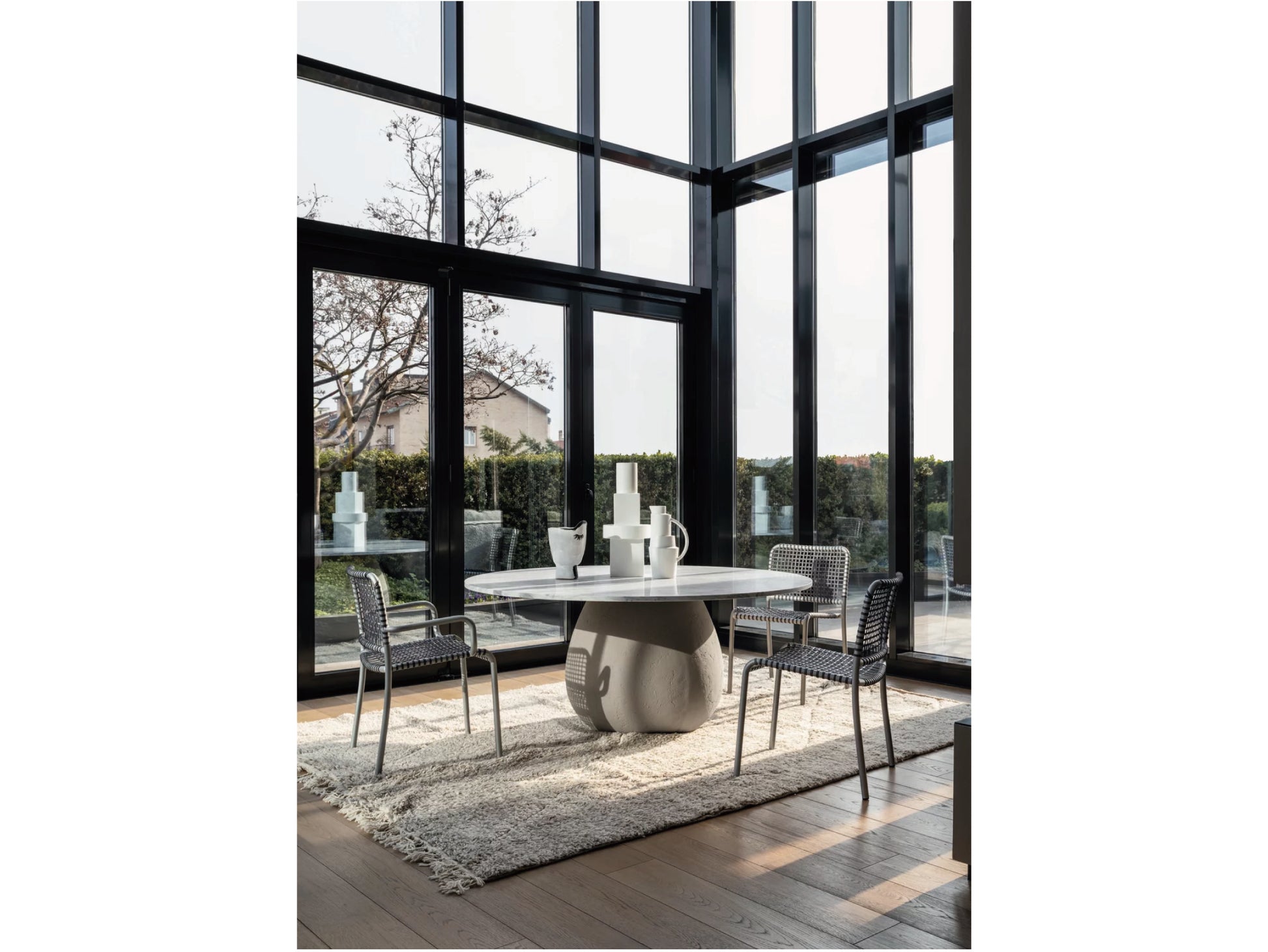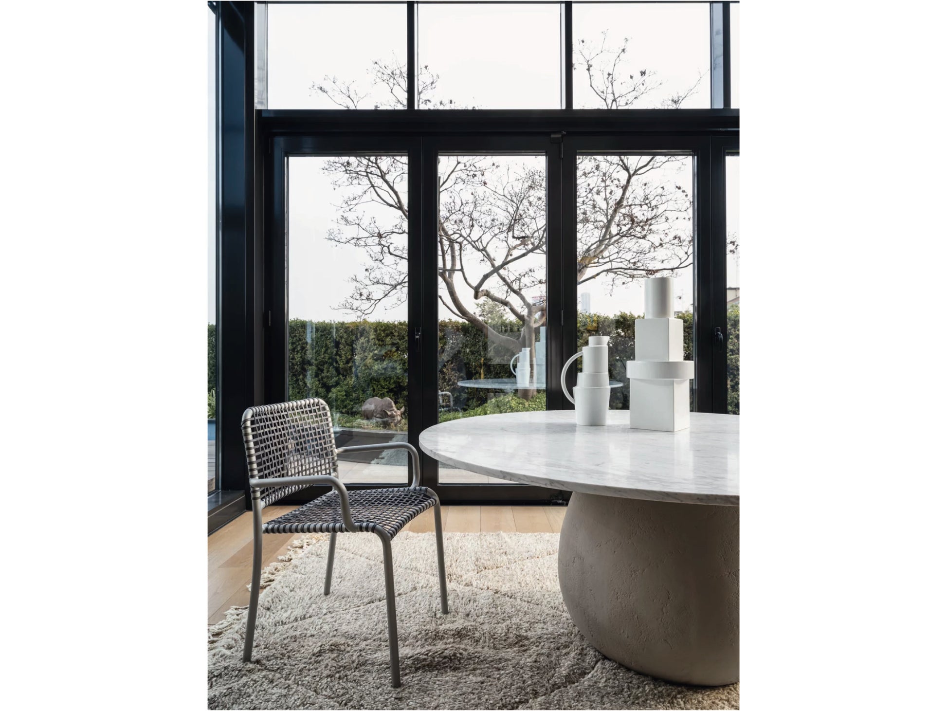 軽やかなアルミ素材を使用しているため、片手で持てるほどの軽さを実現し、日常の出し入れやレイアウト変更もストレスなく行えます。ダイニングチェアとしてはもちろん、書斎やワークスペース、ベッドルームのアクセントチェアとしても活躍。また、使用しない時にはスタッキングが可能なため、省スペースでの収納にも対応。