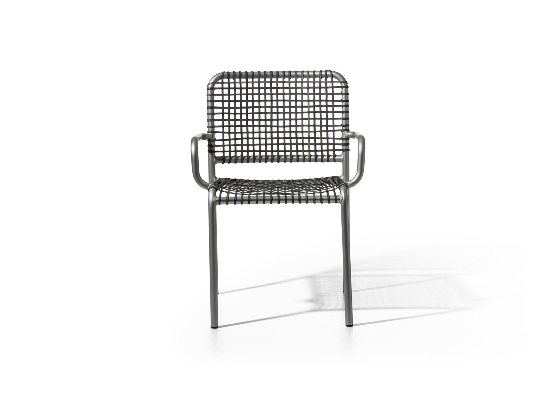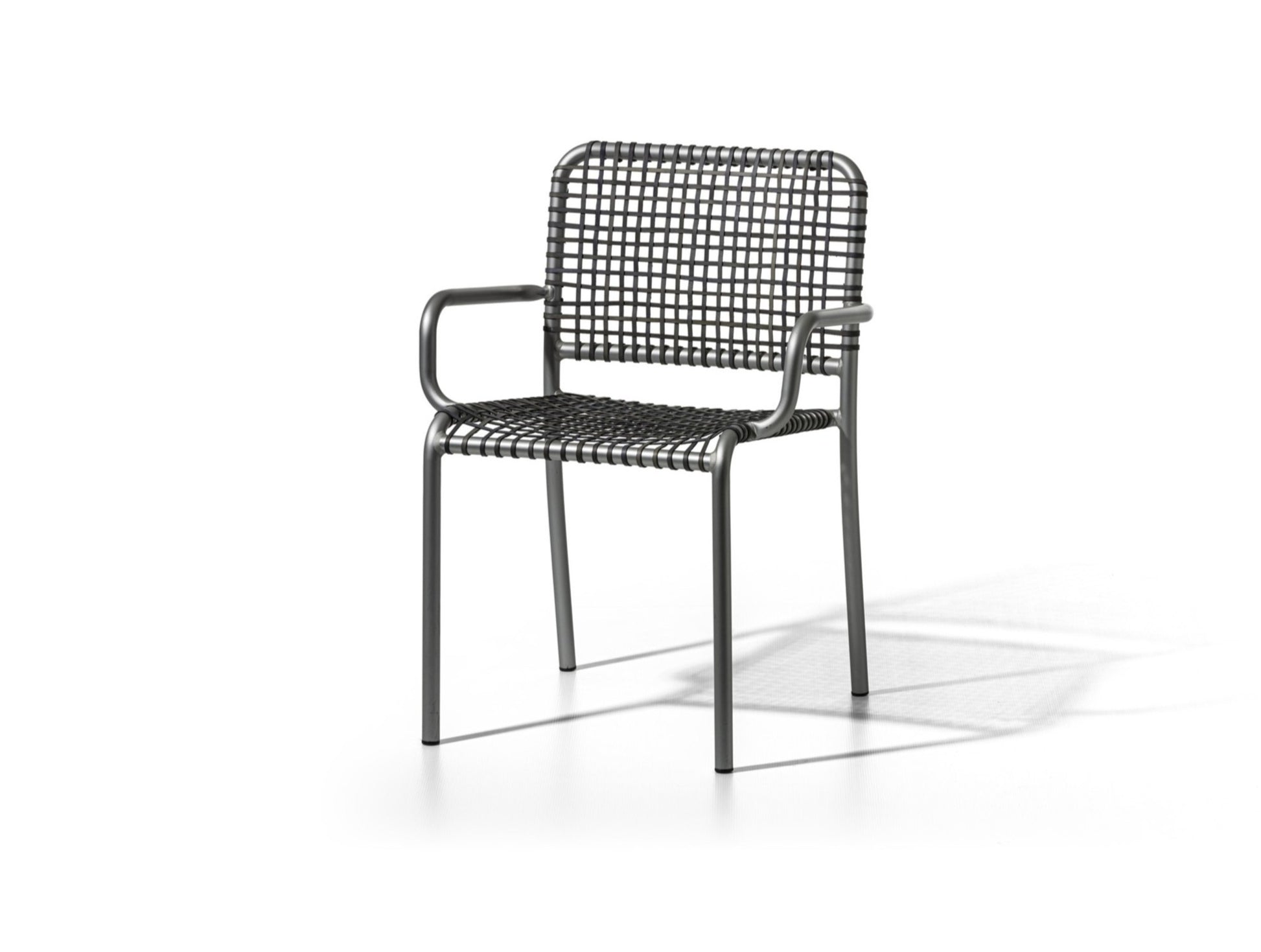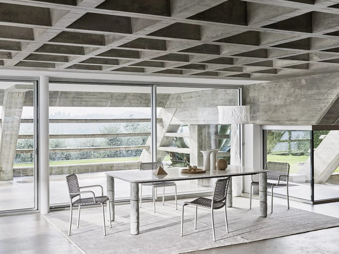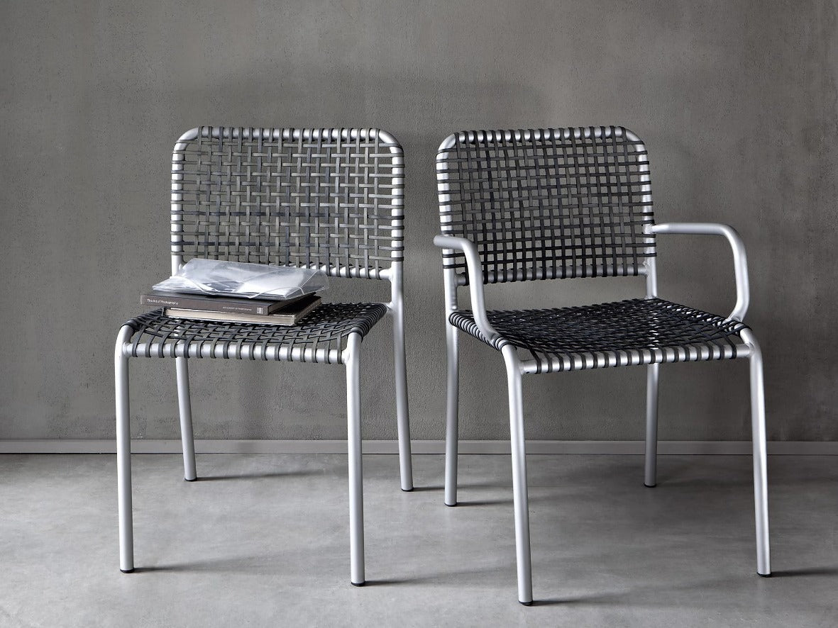 ALLU224Iは、アルミフレームに、ひも状のレザーを丁寧に編み込んだ座面と背もたれが印象的なアームチェア。