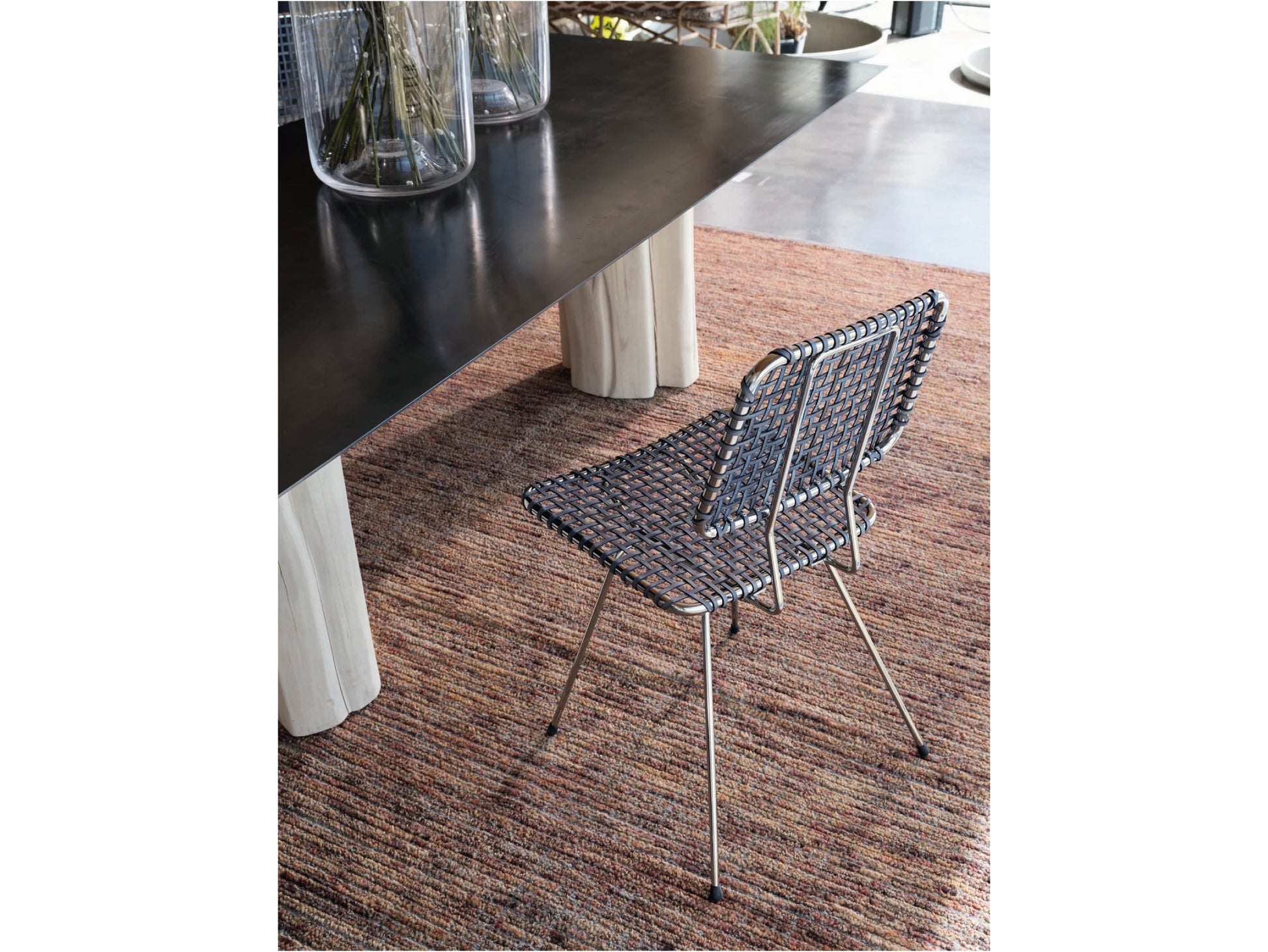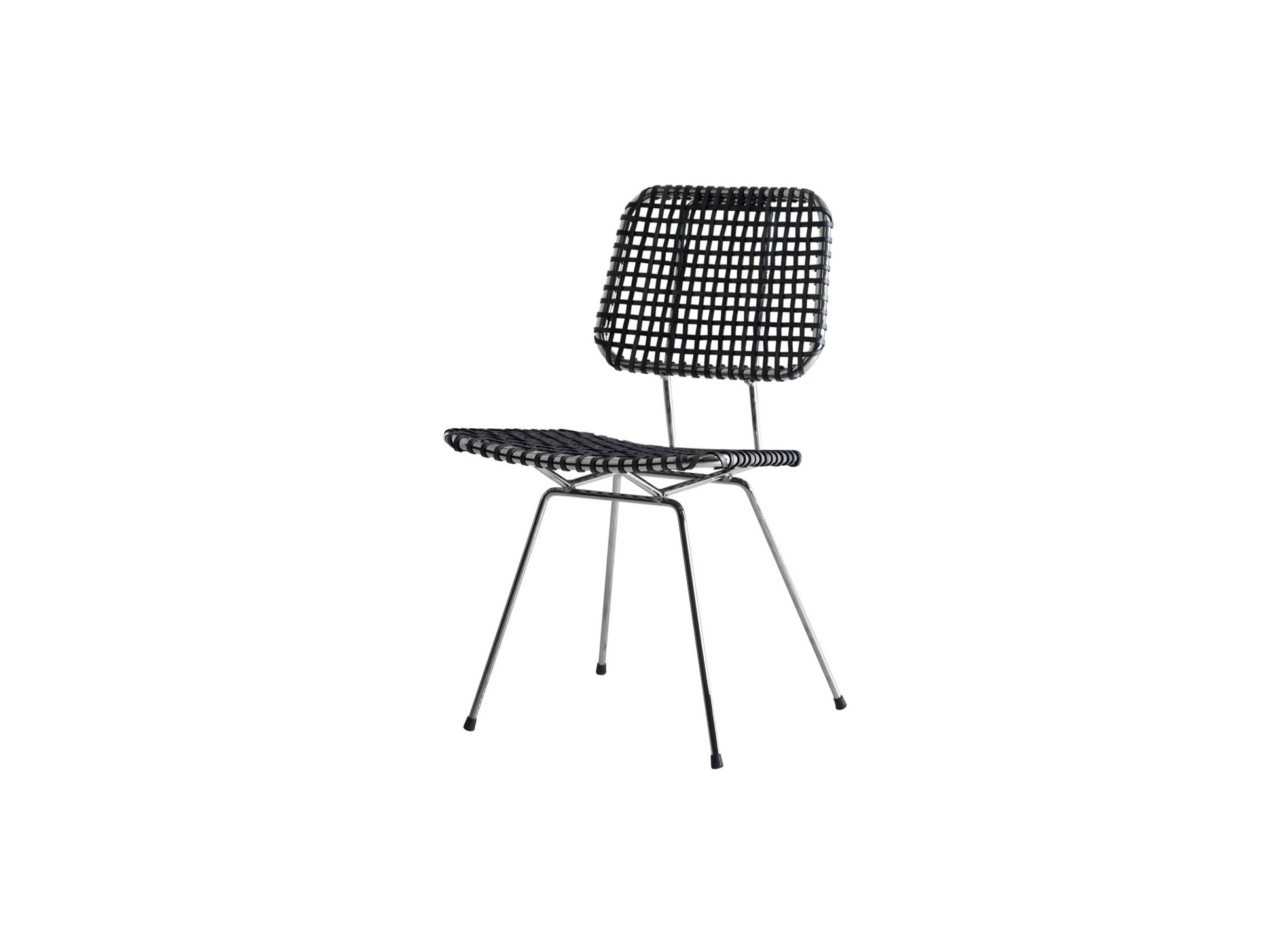 クロムメッキ仕上げのスチールフレームがクールな印象を与えつつ、座面と背もたれにはグレーのひも状の革を丁寧に編み込むことで、上質で暖かみのある表情を生み出しています。