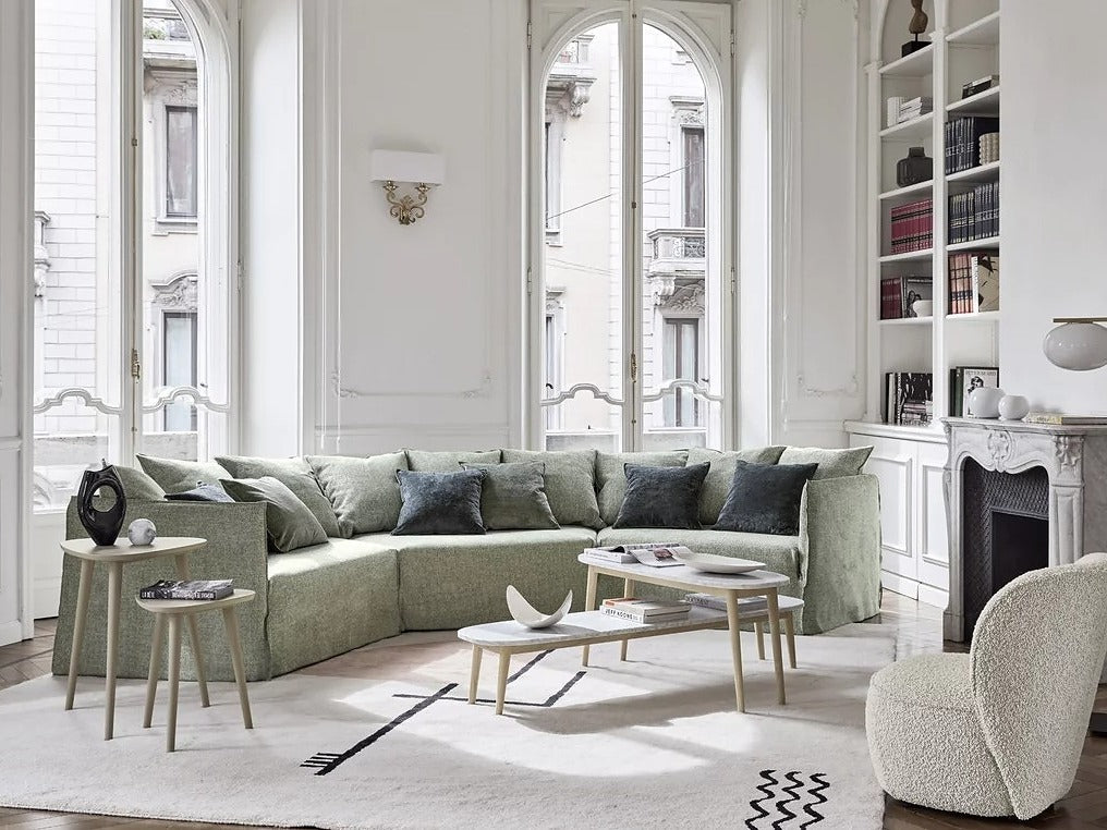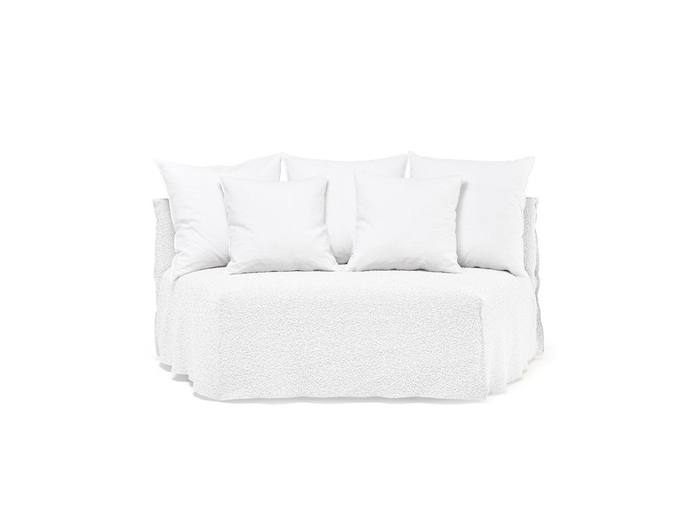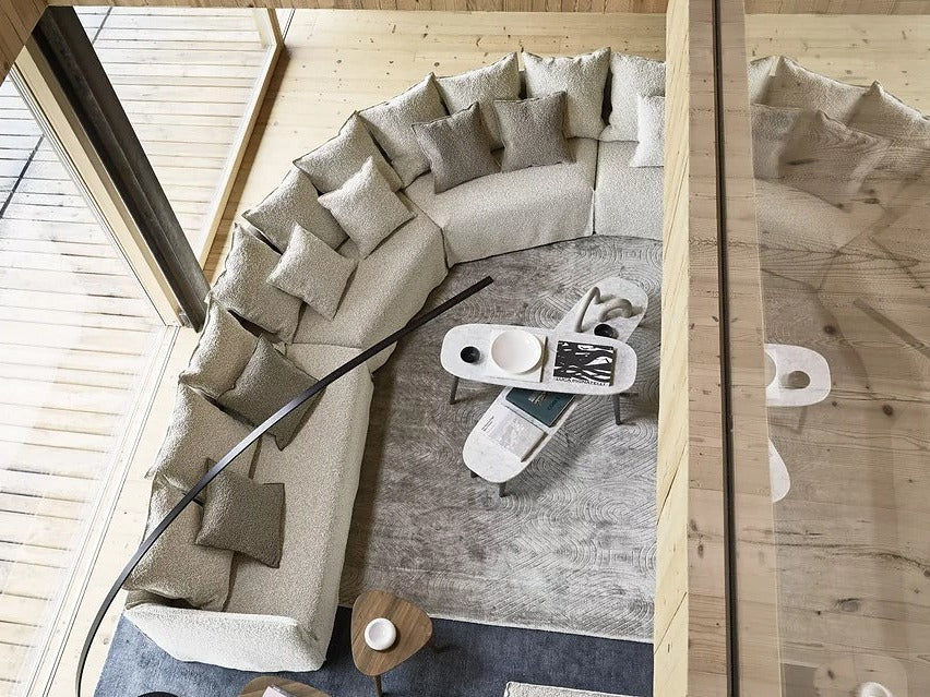 GHOST34は、緩やかなカーブを描く扇形のフォルムが特徴のモジュールソファ。他のモジュールソファと組み合わせることで、空間に合わせたアーチ状のレイアウトを実現できます。流れるようなシルエットがリビングに動きと柔らかさを与え、空間の中心に自然な調和を生み出します。座面は柔らかすぎず硬すぎない心地よさで、ゆったりとした寛ぎの時間を演出します。ファブリックの豊かな表情と包み込まれるようなクッション性が、上質なリラックス空間を演出します。
