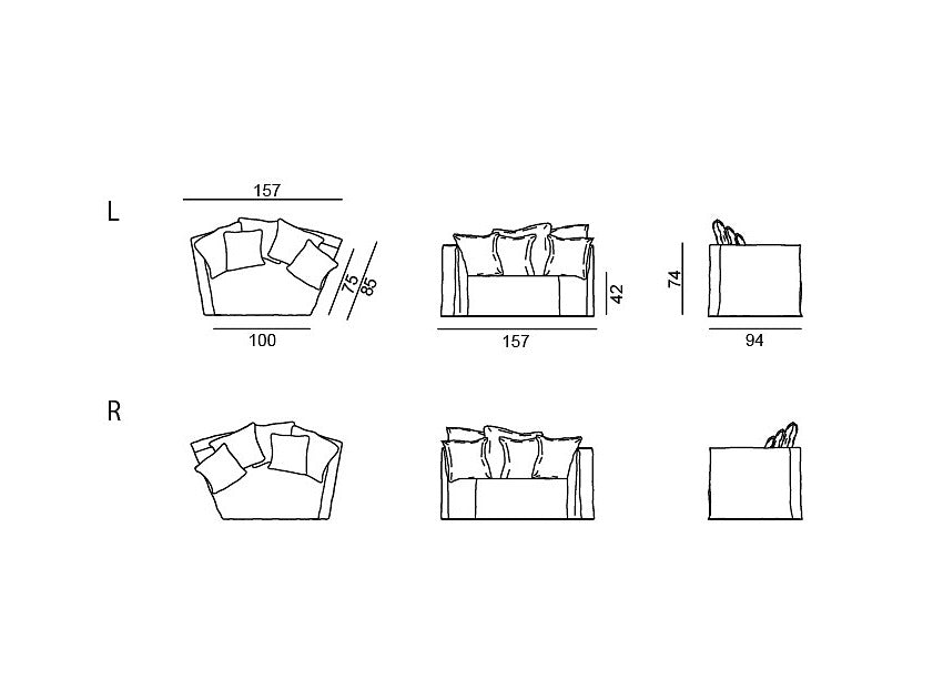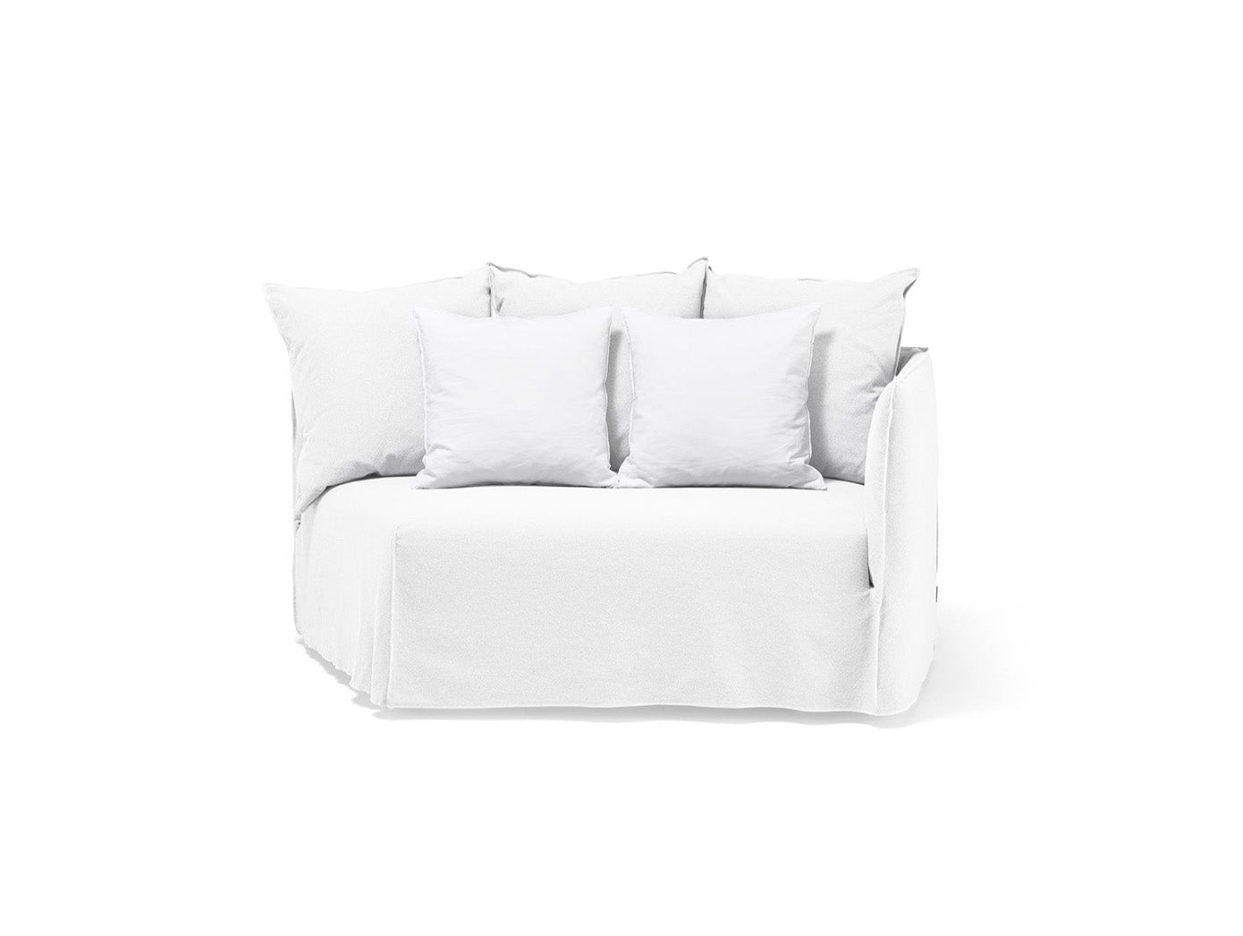GHOST35は、片側にアームを備えたモジュールタイプのソファ。柔らかなカーブを描くフォルムが空間に動きを与え、他のモジュールソファと組み合わせることで、空間に合わせたアーチ状のレイアウトを実現できます。左右のGHOST35(L/R)同士を連結すれば、大きくなりすぎずにアーチ形の構成が可能で、自然な流れのあるリビング空間を演出します。座面は柔らかすぎず硬すぎない絶妙な心地よさで、ゆったりとした寛ぎを提供。ファブリックの豊かな表情と包み込まれるようなクッション性が、上質でリラックス感あふれる時間をもたらします。