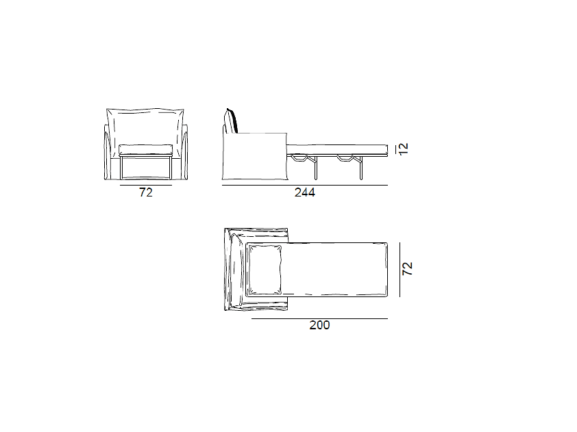 Remarks : カバー取り外し可能。クッション60×60cm2個、50×50cm1個、折畳み式金属フレーム、マットレス(W720xD2000xH110)付き。