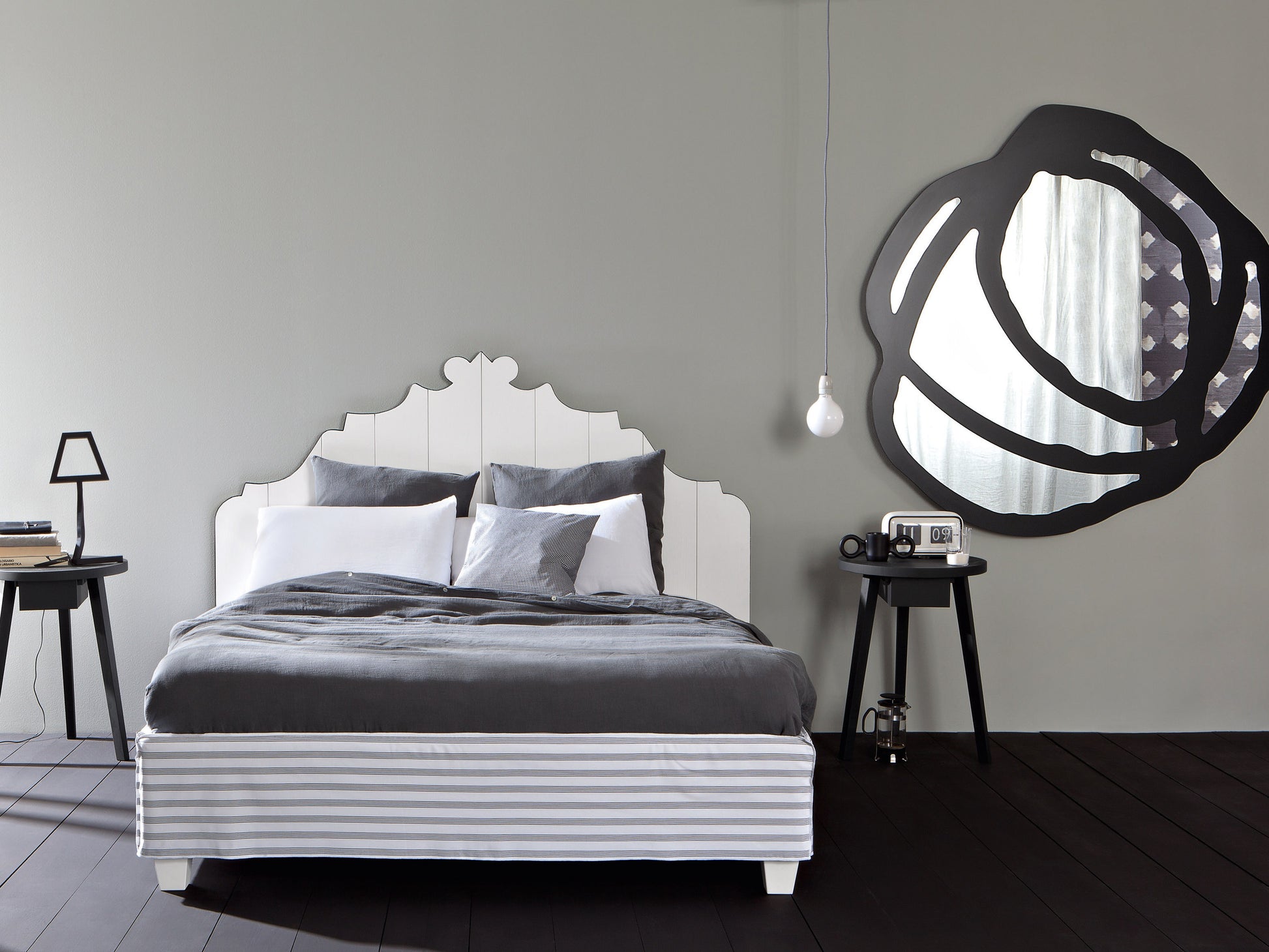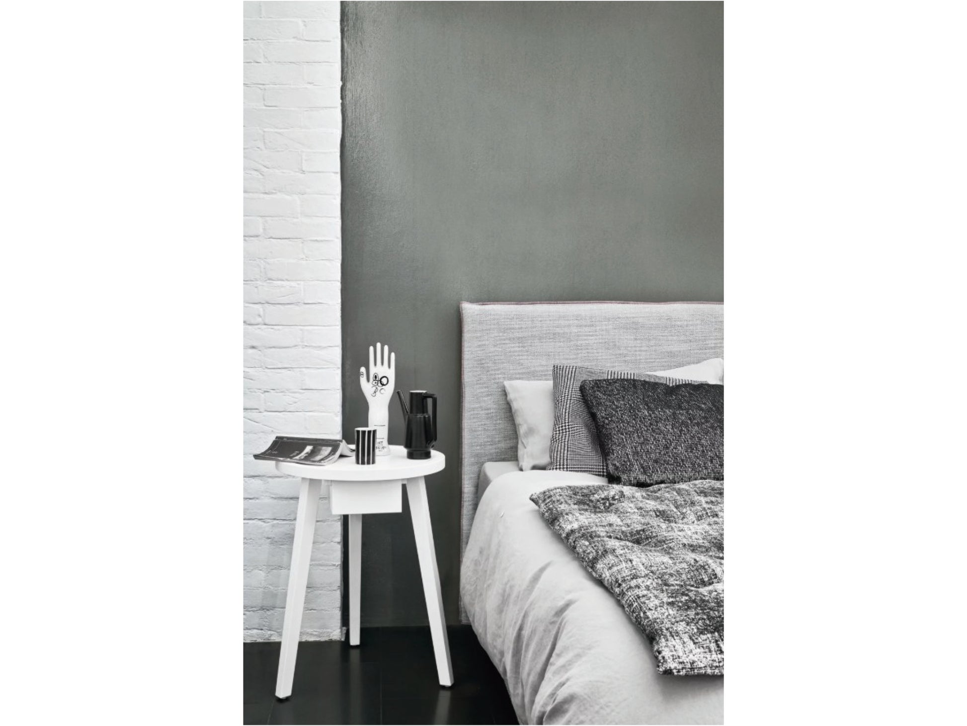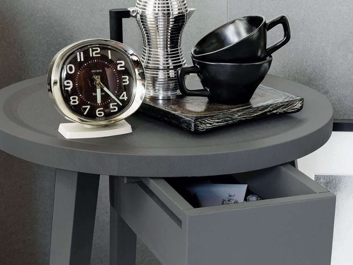 GRAY45は、シンプルで美しいフォルムに引き出しを備えた、機能性の高いサイドテーブルです。丸い天板と3本脚のデザインはGRAY42/44と共通しており、同じくフレームカラーは10色から選べるため、空間に合わせたコーディネートが自在に楽しめます。