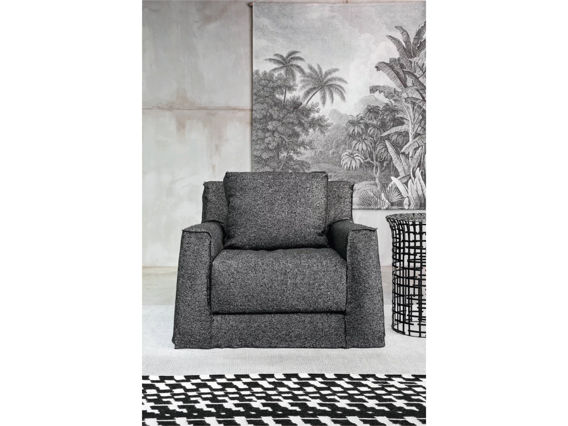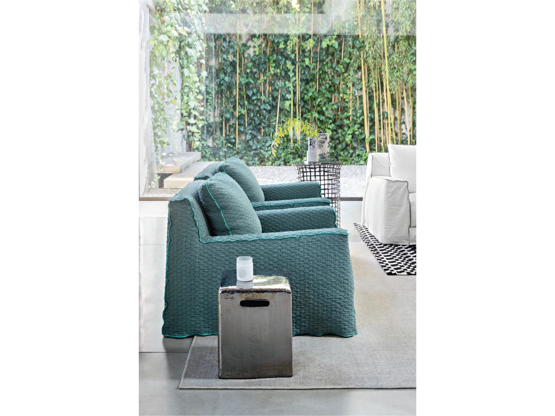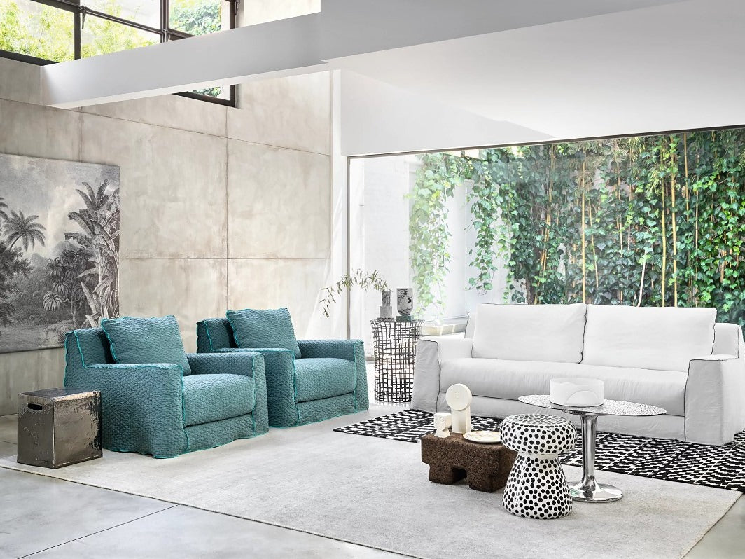 デザインは直線と面の構成で構築された、重厚感のあるシルエット。空間に安定感をもたらしながら、派手さを抑えた上質な表情を演出します。カバーリング仕様のため、ファブリックの掛け替えによって雰囲気を変えられ、長く愛用しやすい点も特徴です。