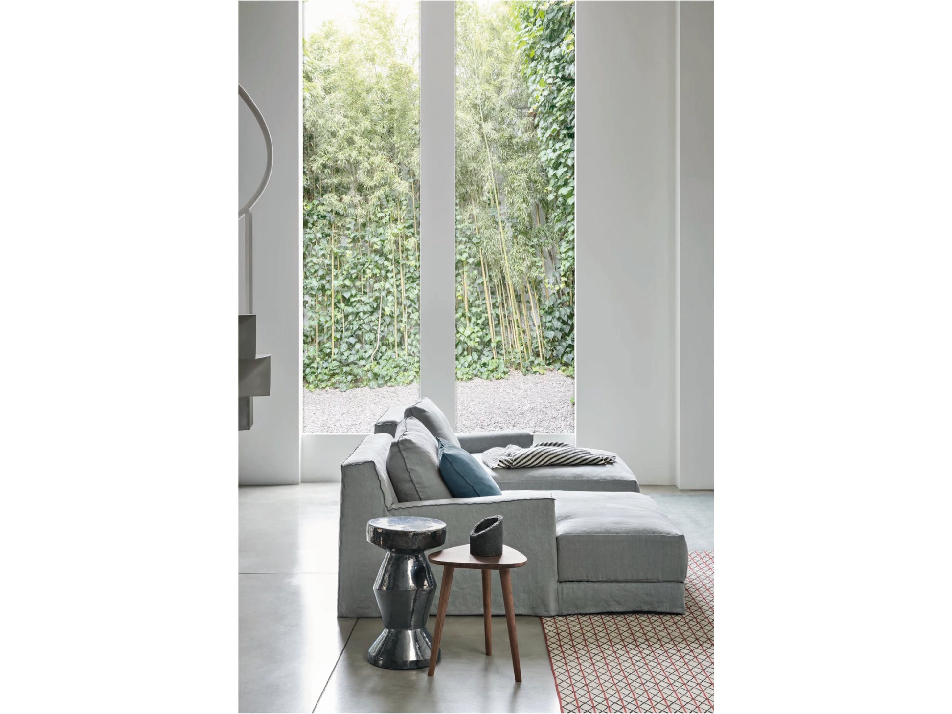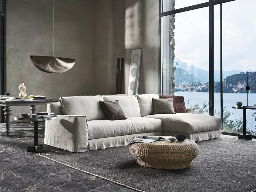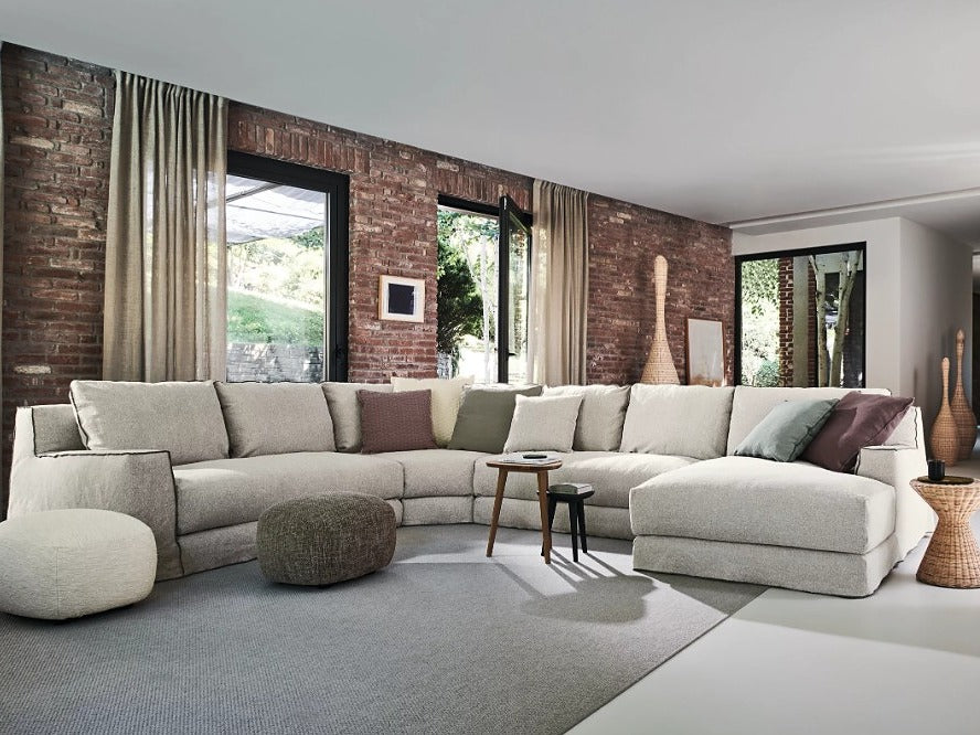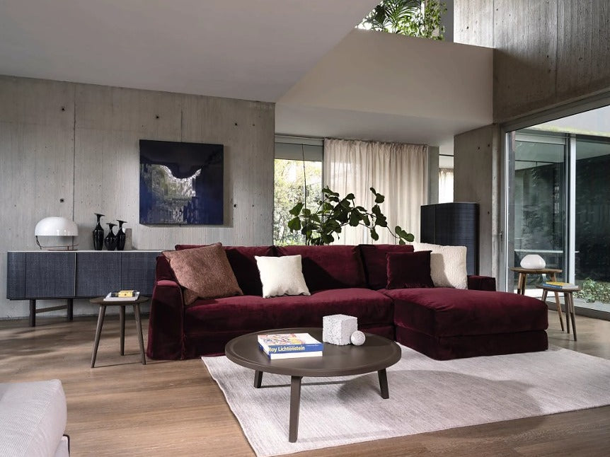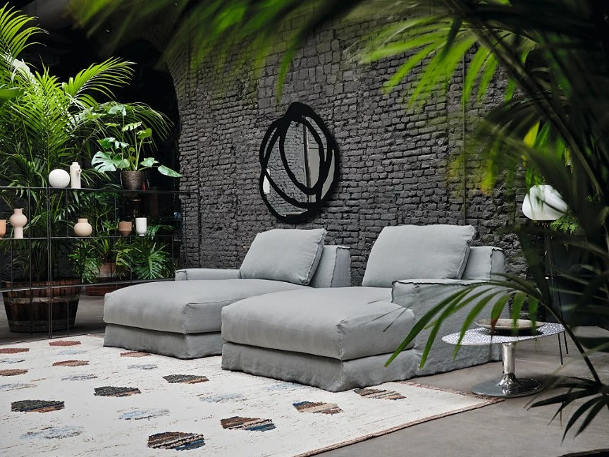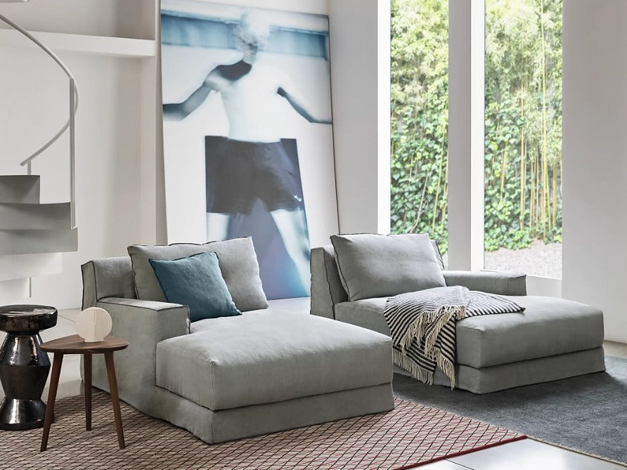 LOLL20 L/Rは、片アーム仕様のモジュラーソファで、ゆったりとくつろげる奥行が魅力です。足を伸ばして横になったり、深く腰掛けて全身を預けたりと、さまざまな姿勢でリラックスできます。
